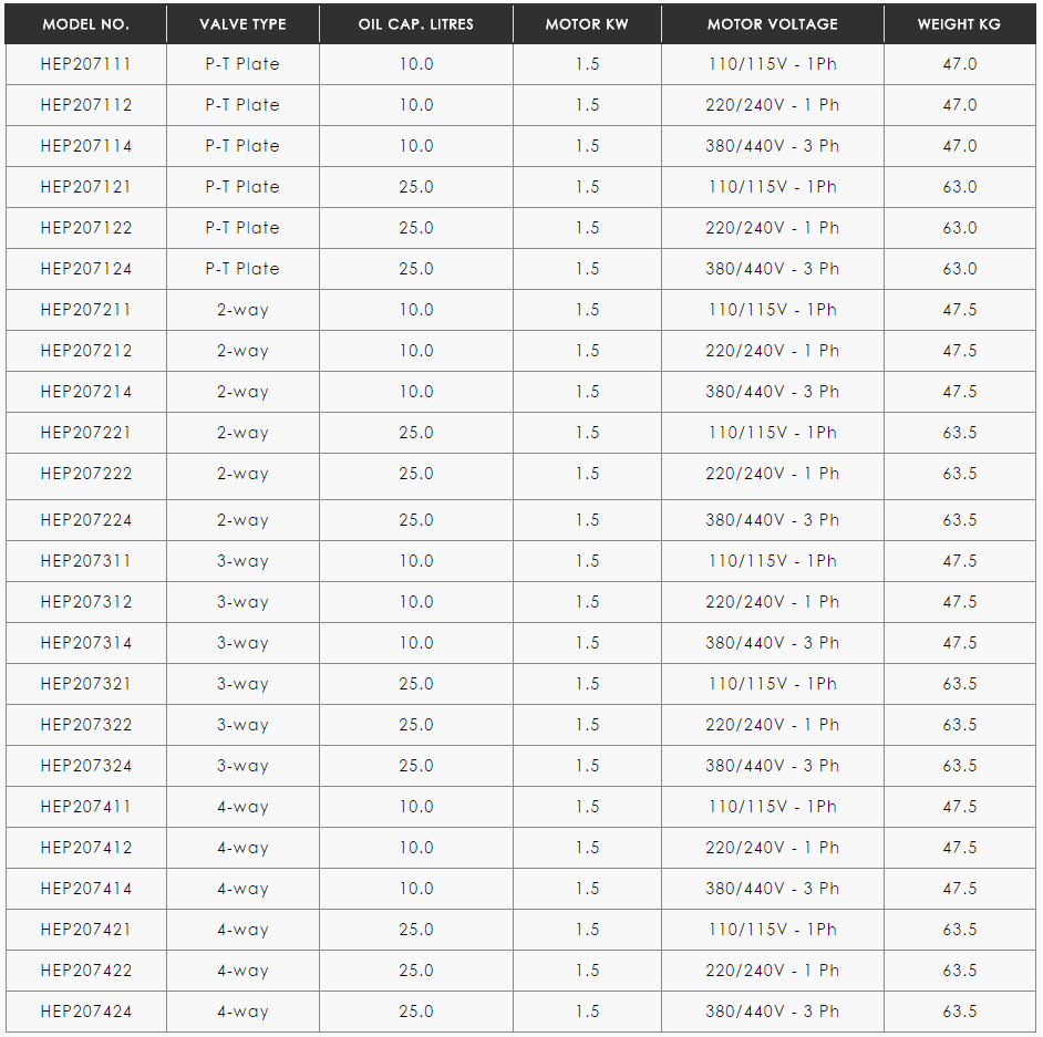 The HEP2 series two stage electric driven hydraulic pump range offers a low pressure flow rate of 7 litres/min with automatic changeover to high pressure flow rate of 0.65 litres/min up to 700 Bar with a choice of 110, 240 or 380/440 Volt motor options. With 2, 3 or 4-way manual and electric solenoid valve options the HEP2 series is suitable for a wide range of applications and is the most commonly selected Hi-Force electric pump. All HEP2 series pumps are also fitted with an externally adjustable pressure relief valve for easy adjustment up to the maximum working pressure of 700 Bar.
