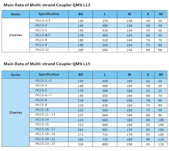 Dòng QMV.L15/L13 chuyên dụng cho các loại cáp đường kính 12.7mm đến 15.7mm. Hệ thống bao gồm khối nối (coupler block), tấm đệm, vỏ bảo vệ và đầu dập hành trình.
