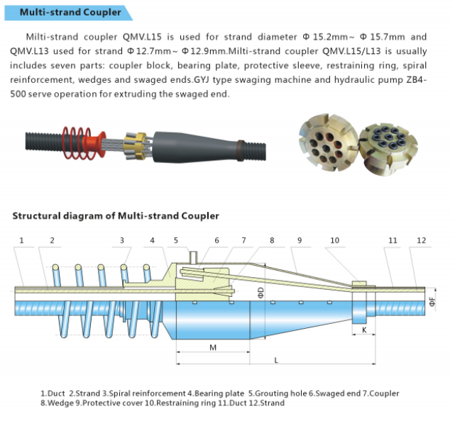 Dòng QMV.L15/L13 chuyên dụng cho các loại cáp đường kính 12.7mm đến 15.7mm. Hệ thống bao gồm khối nối (coupler block), tấm đệm, vỏ bảo vệ và đầu dập hành trình.