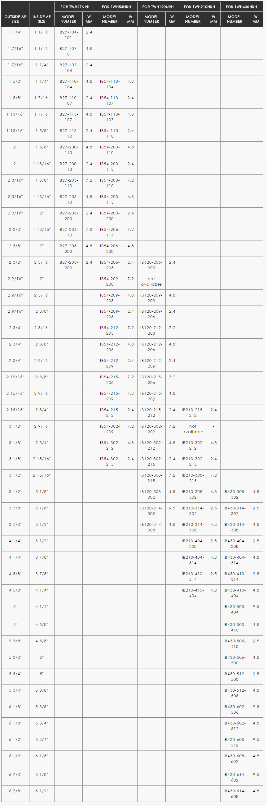 To reduce the female hexagon AF size of the TWH-NRH imperial ratchet heads, these Hi-Force hexagon reducer bushes offer an easy and economical solution. Just select your outside AF size (i.e ratchet head AF size) and the required inside AF size to determine the model number. Please note that wall thickness (specified below as ‘W’ dimension) must be added to the minimum radius dimension of your ratchet head when using a reducer bush.