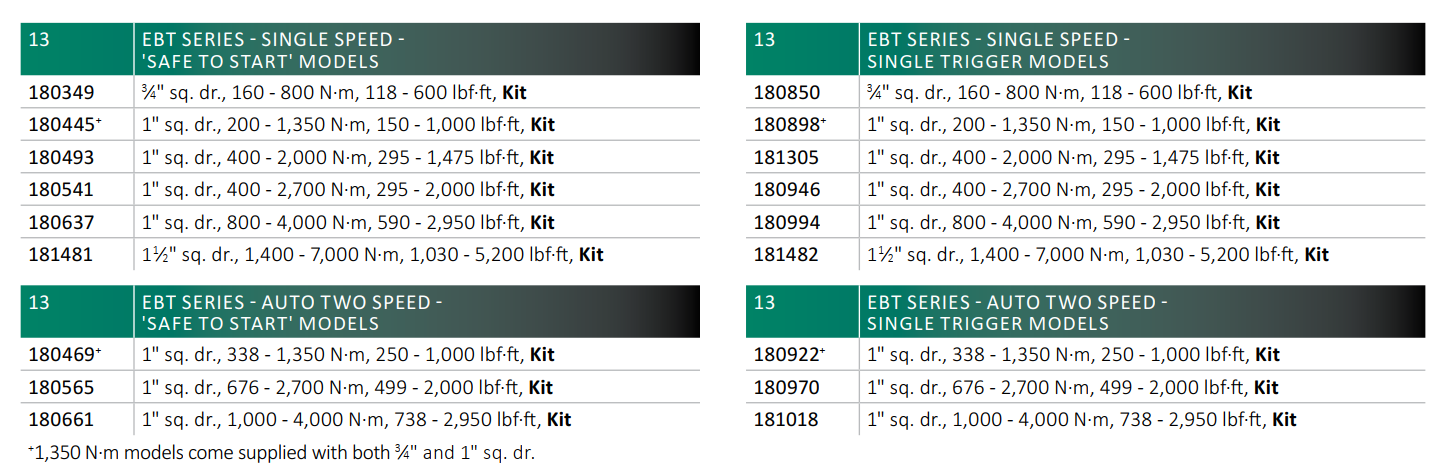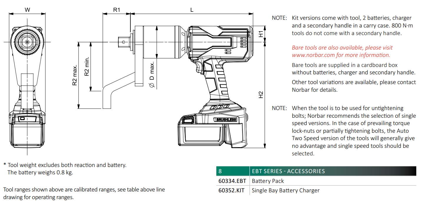 Thông số EBT-800 EBT-1350 EBT-1350 (2 Speed) EBT-2000 EBT-2700 EBT-2700 (2 Speed) EBT-4000 EBT-4000 (2 Speed) EBT-7000 Phạm vi hoạt động (N·m) 100-800 120-1350 338-1350 200-2000 270-2700 676-2700 400-4000 1000-4000 1400-7000 Phạm vi hiệu chuẩn (N·m) 160-800 200-1350 338-1350 400-2000 400-2700 676-2700 800-4000 1000-4000 1400-7000 Tốc độ đầu ra (vòng/phút) 11.2 6.5 32 4.2 3.3 13 2.3 9.5 1.2 Đường kính ØD tối đa (mm) 52 72 72 68 80 80 92 92 119 Chiều cao H1 (mm) 40 40 40 40 40 40 40 40 40 Chiều cao H2 (mm) 262 262 262 262 262 262 262 262 262 Chiều dài L (mm) 271 298 317 294 298 333 352 387 378 Bán kính R1 (mm) 59 76 76 75 76 76 70 70 90 Phản lực R2 min (mm) 68 124 124 120 124 124 125 125 160 Phản lực R2 max (mm) 131 167 167 165 167 167 175 175 210 Chiều rộng W (mm) 90 90 90 90 90 90 90 90 90 Trọng lượng máy (kg) 3.7 5.7 5.9 4.9 5.9 6.8 7.9 8.3 13.1 Trọng lượng tay phản lực (kg) 0.8 1.4 1.4 1.1 1.4 1.4 2.5 2.5 3.9